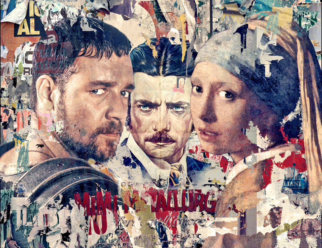 L'artista romano Marco Innocenti pop espone undici tele realizzate con la tecnica dell'illustrazione digitale e dello strappo fisico di carta di manifesti sapientemente incollati sul quadro stesso. Il risultato che ne esce è quello di un insieme di immagini emblematiche, incollate insieme, assemblate tra loro in attesa dell’approvazione della sensibilità di chi se le ritrova di fronte. Miti del cinema, personaggi famosi di ieri e di oggi, campioni sportivi, cartoons, brand prestigiosi, icone artistiche contemporanee e del passato, fatte incontrare, messe a confronto in una sorta di presente continuo, come se il tempo non fosse mai stato un loro problema. Insieme dialogano, si intendono meravigliosamente come se non avessero atteso altro che riuscire finalmente ad emergere dalla monotonia di una prigione dorata. |