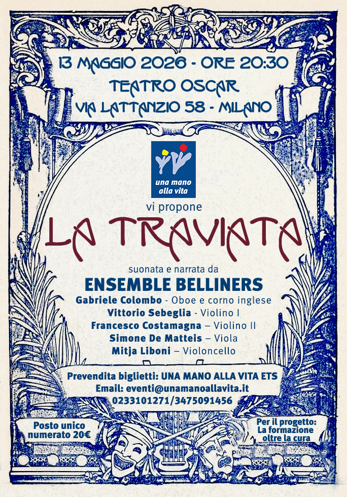 Versione inedita e coinvolgente de “La Traviata” di Giuseppe Verdi, portata in scena dall’Ensemble Belliners. L’evento non è solo un appuntamento culturale di alto profilo, ma una serata dedicata al cuore: l’intero ricavato sarà infatti devoluto a Una Mano alla Vita ETS per finanziare il progetto “La formazione oltre la cura”.